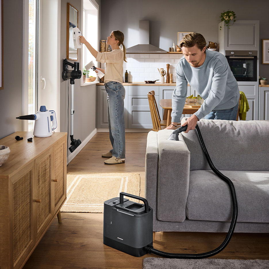 Parni čistači su izuzetno temeljiti. Para, koja je zagrijana na oko 150 Celzijevih stupnjeva, pouzdano ubija klice i grinje – idealno za alergičare. Para prodire duboko u tapeciranje i uklanja tvrdokorne i duboko ukorijenjene nečistoće, kao i neugodne mirise.Koristi svoj parni čistač s odgovarajućom navlakom za tkaninu. Ona raspoređuje paru, sprječava ogrebotine i skuplja prljavštinu. Nakon čišćenja, navlaku možeš staviti u perilicu rublja.