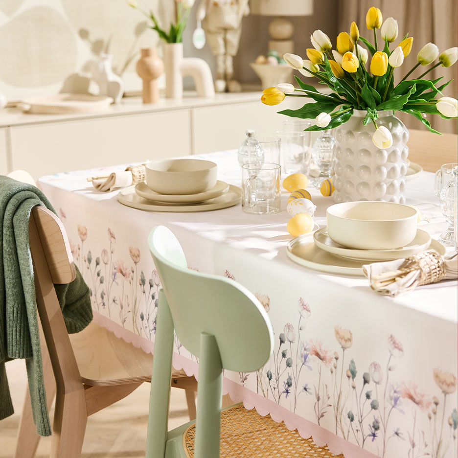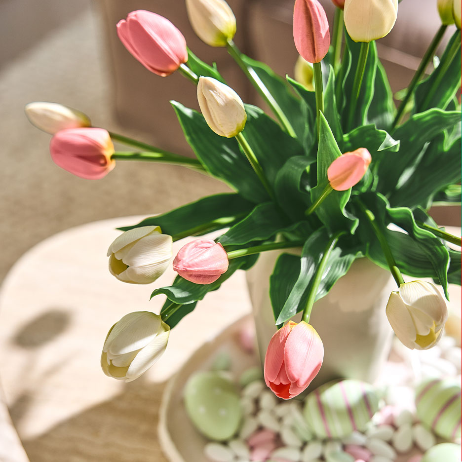 - Ako na stol staviš pastelne tonove, ne moraš se uopće truditi – uskrsna atmosfera dolazi sama od sebe. Treba ti samo stolnjak u pastelnoj nijansi, proljetno cvijeće poput tulipana ili narcisa i simpatične figurice uskrsnih zečeva. Nemaš vremena za cvjećarnicu? Umjetni buketi tulipana s Real-Touch efektom praktički se ne razlikuju od onih pravih iz vrta!